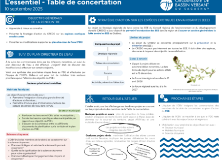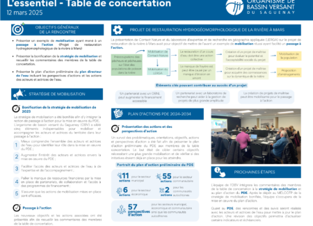- Participer à la Stratégie de mobilisation des acteurs.trices de l’eau de la ZGIEBV Saguenay, au bilan de la mise en œuvre du PDE Saguenay et à la mise en place des comités sectoriels et des comités de travail.